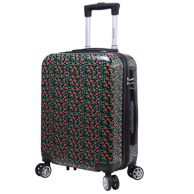 Trolley made of glossy printed ABS with rose pattern. Features a customized handle, front logo, and password lock.